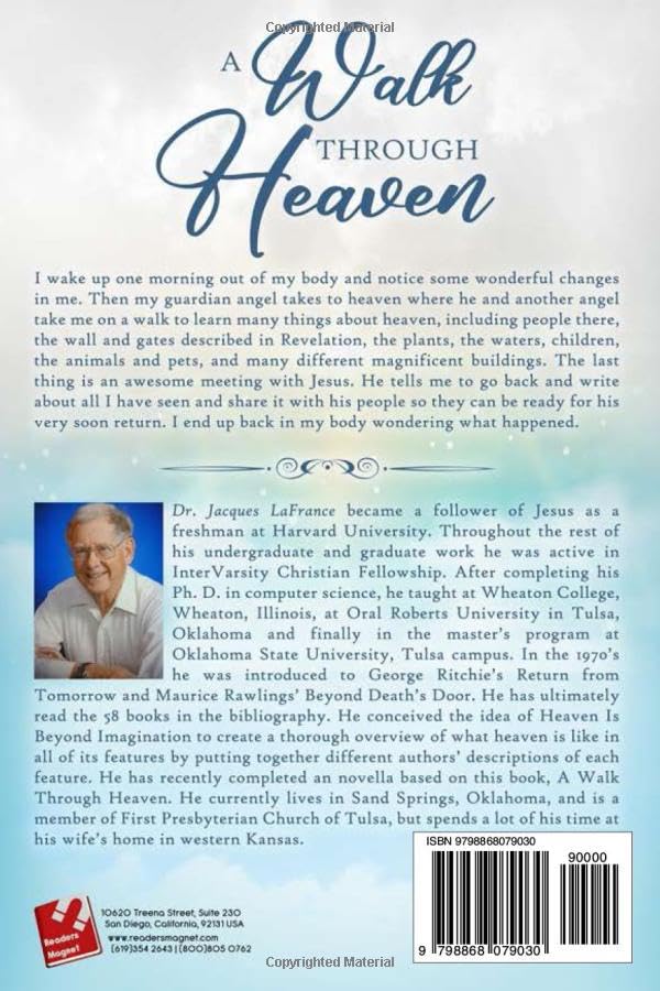 I wake up one morning out of my body, confused, but notice some wonderful changes in me. Then my guardian angel takes me to heaven where he and another angel take me on a walk to learn many things about heaven, including the people there, the wall and gates described in Revelation, the plants, waters, children, animals, pets, and many different magnificent buildings, including mansions. The last thing is an awesome meeting with Jesus. He tells me to go back and write about all I have seen and share it with his people so they can be ready for his very soon return. I end up back in my body wondering what happened. All the heaven descriptions are from eyewitness testimony recorded in Heaven Is Beyond Imagination. This book will help you imagine your own experience in heaven or that of a departed loved one. It is a personalized and condensed version of the more complete Heaven Is Beyond Imagination. It is an easy and entertaining read that has the potential to bless you (make you want to read the larger more complete volume!)